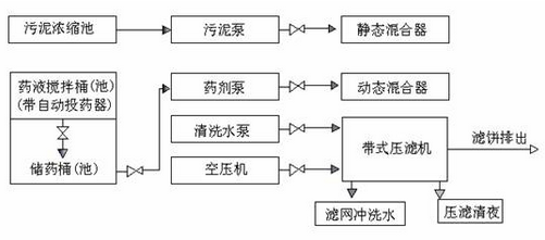 廣州綠豐多輥帶式壓濾機(污泥脫水機)泥漿類脫水工藝流程示意圖